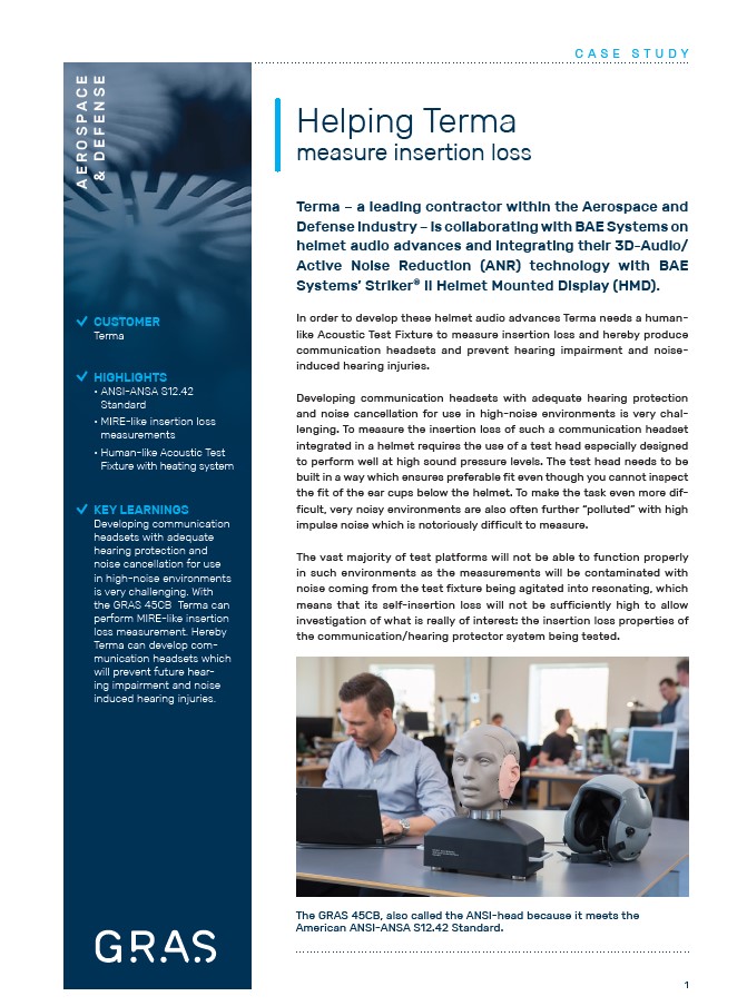 In collaboration with BAE Systems, Terma set out to improve audio performance in next-generation helmets. By using the GRAS 45CB acoustic test fixture, they were able to perform MIRE-like insertion loss testing under realistic conditions—enabling faster development cycles and more accurate validation of headset performance.